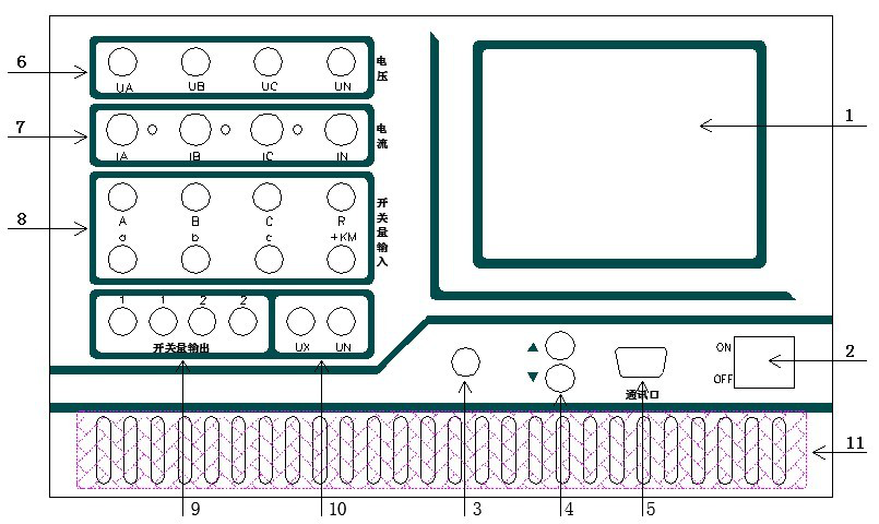 7.IA、IB、IC、IN 為電流輸出端子,各電流端子(IA、IB、IC)右側(cè)的小信號(hào)燈指示該路電流輸出是否存在波形畸變或負(fù)載開(kāi)路