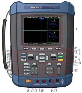 手持式局放測試儀主機的前面板分為若干功能區(qū),根據(jù)上圖標(biāo)注標(biāo)號分別為:
