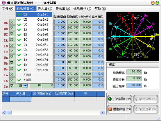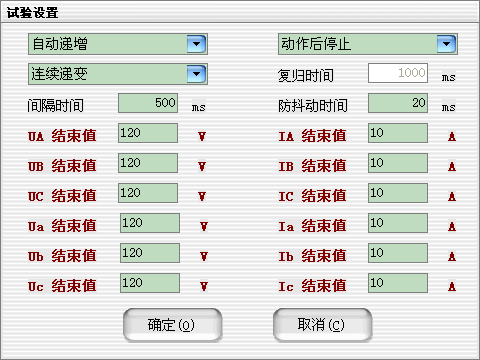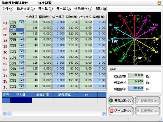 當(dāng)需要使用的輸出相被選擇后,可以設(shè)定微機(jī)繼電保護(hù)測(cè)試儀各輸出相的起始參數(shù),比如幅值、相位,接著可以設(shè)定幅值的變化步長(zhǎng)和相位的變化步長(zhǎng)。一旦通道的輸出達(dá)到大值或小值后,如果試驗(yàn)還沒有停止,通道繼續(xù)保持輸出,不再遞增或遞減。