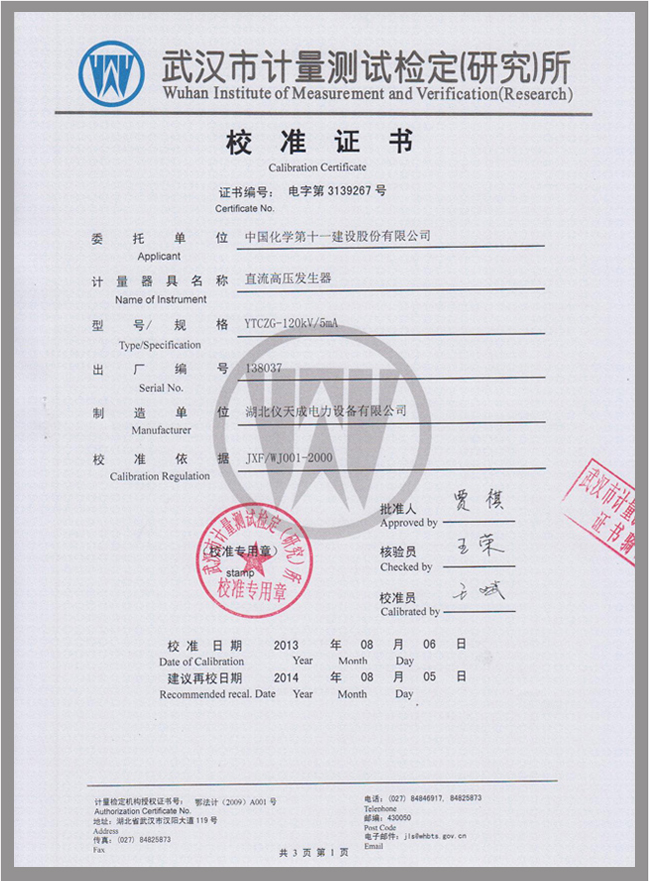 轉(zhuǎn)載:"YTCZG-120kV/2mA直流高壓發(fā)生器鑒定證書" 請注明來源于儀天成電力。 更多技術(shù)問題請致電儀天成電力客戶服務(wù):027-87876585,技術(shù)部專線:027-87876585,在線客服:
