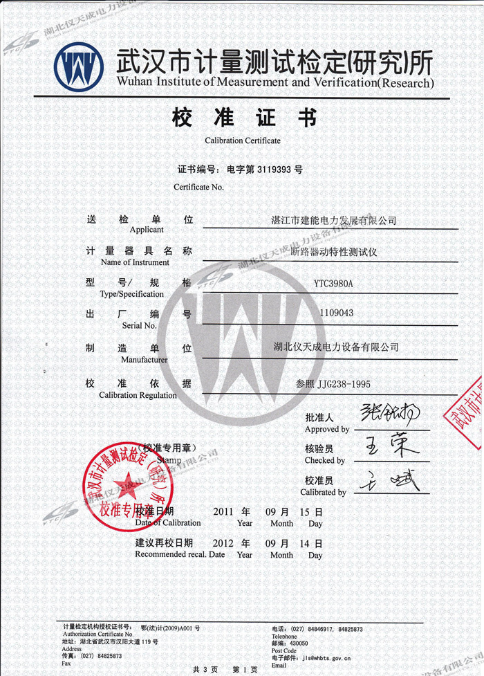 轉(zhuǎn)載:"YTC3980A斷路器動特性測試儀的資質(zhì)證書" 請注明來源于儀天成電力。 更多技術(shù)問題請致電儀天成電力客戶服務(wù):027-87876585,技術(shù)部專線:027-87876585,在線客服:719388481